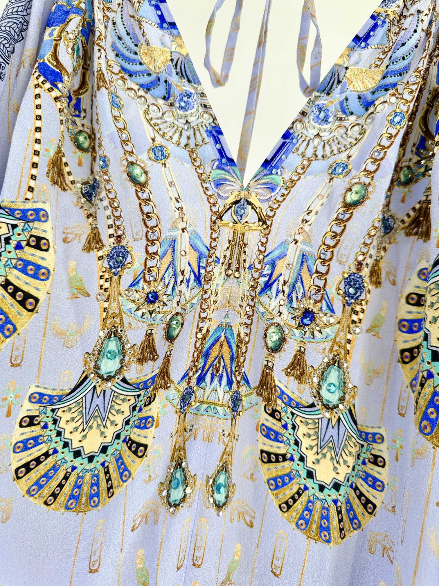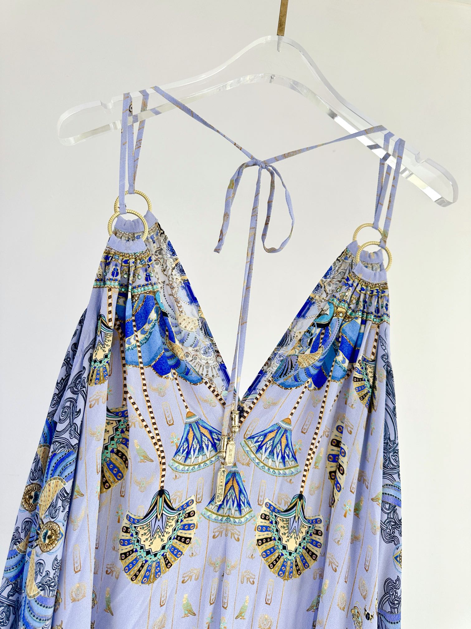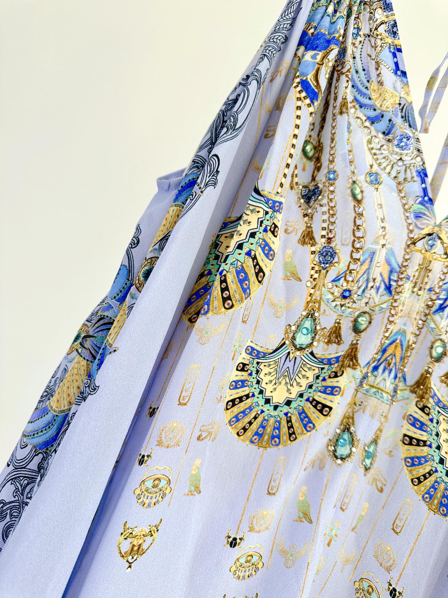 The Under Scarab Skies Ring Detail Strap Dress delves into an ancient soft blue and lilac realm of ankhs, scarabs, Egyptian phoenixes, and mystical gods. This opulent silk maxi dress features an elegant V front and V back neckline with a double strap detail flowing from lustrous ring hardware details. The relaxed body flows in a soft a line silhouette to billow at the maxi length hemline.