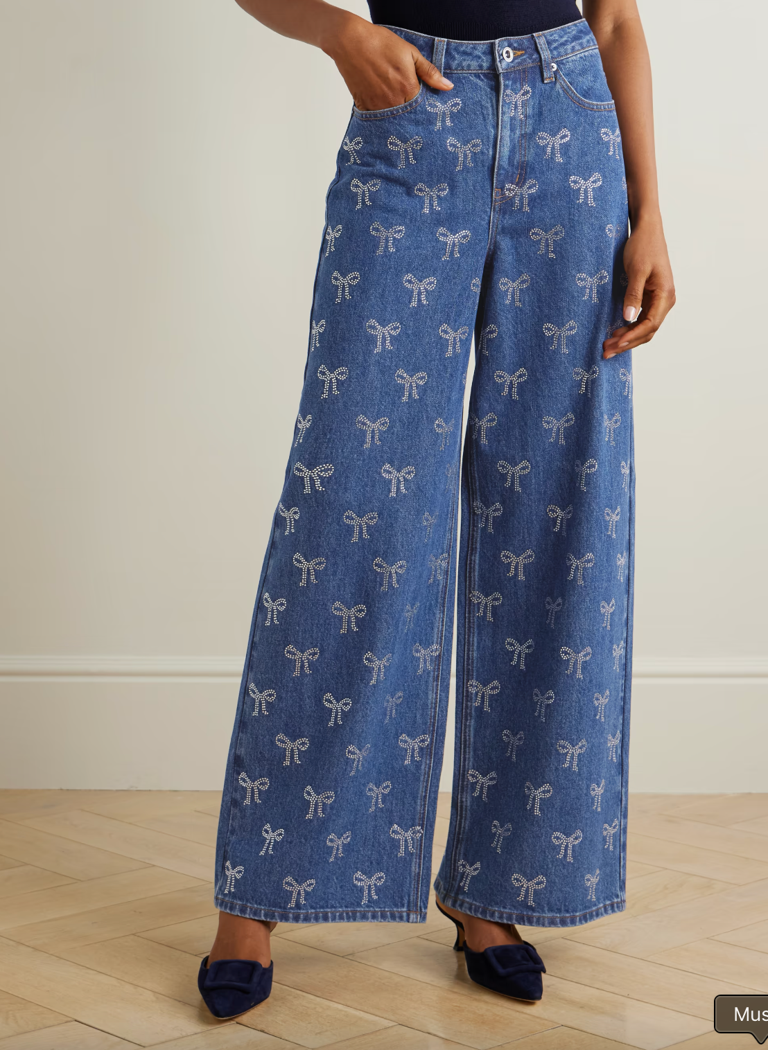 SP jeans are as glamorous as you’d expect. Made from blue denim, they’re embellished with scores of shimmering crystals arranged to depict the label’s signature bows and have relaxed wide legs.